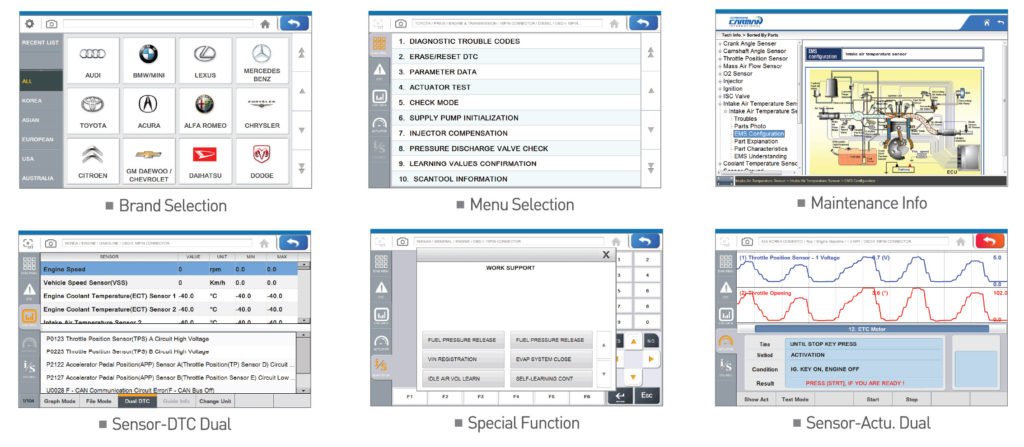 Protocolos | ISO 9142-2, ISO 14230-2, ISO 15765-4, SAE-J1850 PWM CAN ISO 11898, de alta velocidad, velocidad media, baja velocidad y de un solo cable, código intermitente en serie de alta velocidad de línea K/L Ethernet Protocolo, protocolo de bytes, Protocolo Honda Diag-H, KWPT1281, TP2.0, TP1.6, J2610 (Chrysler SCI) |